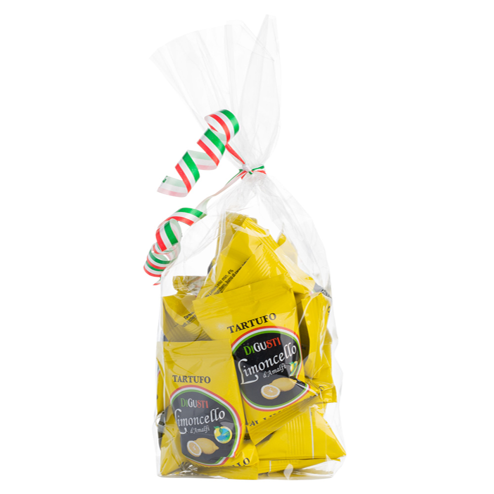 Handgemachte Limoncello IGP (Amalfi) Pralinen. Luxus verpackt in einer transparenten Plastiktüte mit italienischer Schleife (tricolori). Köstlich zum Kaffee und sehr schön zum Verschenken! 100g (ca. 5 Stück).